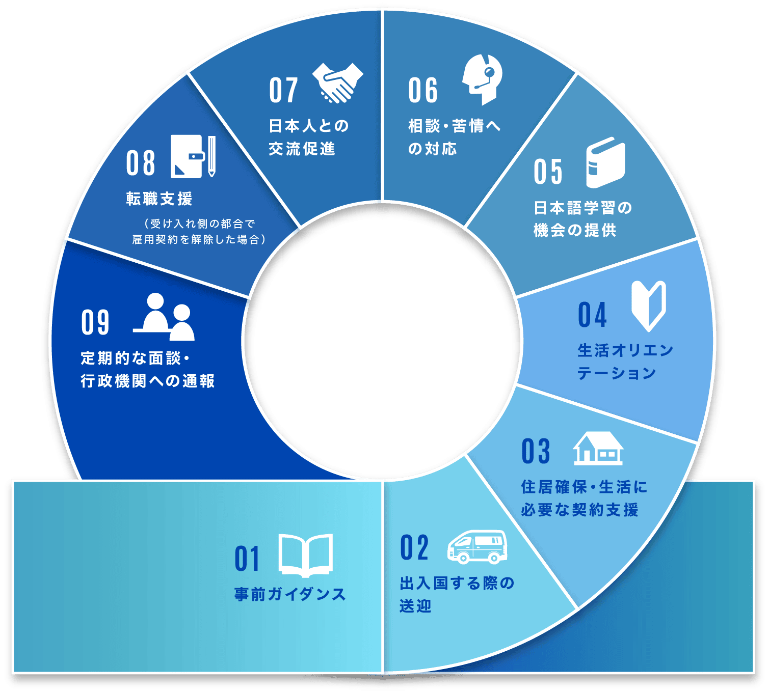 受入企業は、特定技能外国人の在留に関する諸申請にあたって支援計画書を作成する必要があります。その支援計画の作成や、複雑で専門知識が求められる各種申請手続きを当社が丸ごとサポートいたします。また、特定技能外国人に対して以下の支援を行う義務があります。
